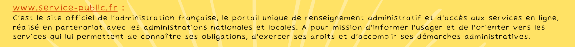 www.service-public.fr : C’est le site officiel de l’administration française, le portail unique de renseignement administratif et d’accès aux services en ligne, réalisé en partenariat avec les administrations nationales et locales. A pour mission d’informer l’usager et de l’orienter vers les services qui lui permettent de connaître ses obligations, d’exercer ses droits et d’accomplir ses démarches administratives.