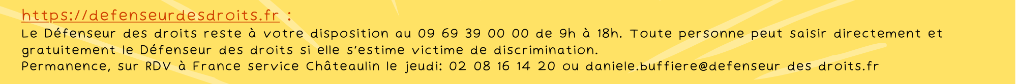 Permanence, sur RDV à France service Châteaulin le jeudi: 02 08 16 14 20 ou daniele.buffiere@defenseur des droits.fr