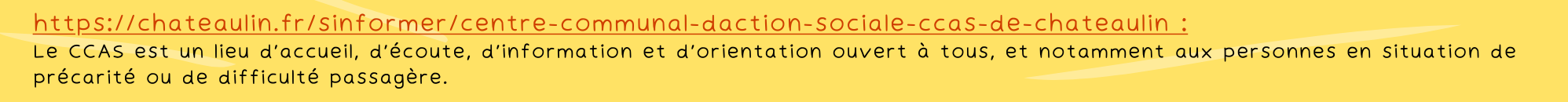 https://www.chateaulin.fr/chateaulin/principal/vie-locale/social/centre-communal-daction-sociale-ccas Le CCAS est un lieu d’accueil, d’écoute, d’information et d’orientation ouvert à tous, et notamment aux personnes en situation de précarité ou de difficulté passagère.