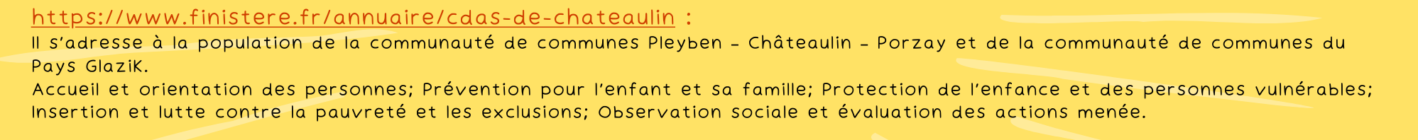 https://www.finistere.fr/Les-services-pres-de-chez-vous/Les-Centres-departementaux-d-action-sociale-CDAS-du-Finistere/CDAS-de-Chateaulin Il s’adresse à la population de la communauté de communes Pleyben – Châteaulin – Porzay et de la communauté de communes du Pays Glazik.