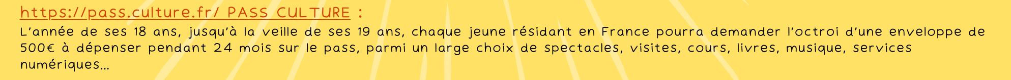https://pass.culture.fr/ PASS CULTURE : L’année de ses 18 ans, jusqu’à la veille de ses 19 ans, chaque jeune résidant en France pourra demander l’octroi d’une enveloppe de 500€ à dépenser pendant 24 mois sur le pass, parmi un large choix de spectacles, visites, cours, livres, musique, services numériques…
