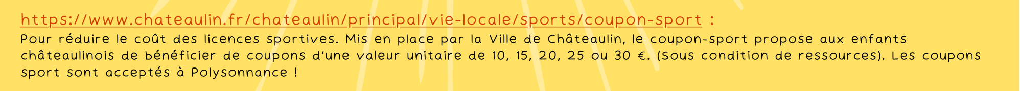 https://www.chateaulin.fr/chateaulin/principal/vie-locale/sports/coupon-sport Pour réduire le coût des licences sportives. Mis en place par la Ville de Châteaulin, le coupon-sport propose aux enfants châteaulinois de bénéficier de coupons d’une valeur unitaire de 10, 15, 20, 25 ou 30 €. (Sous condition de ressources). Les coupons sport sont acceptés à Polysonnance !