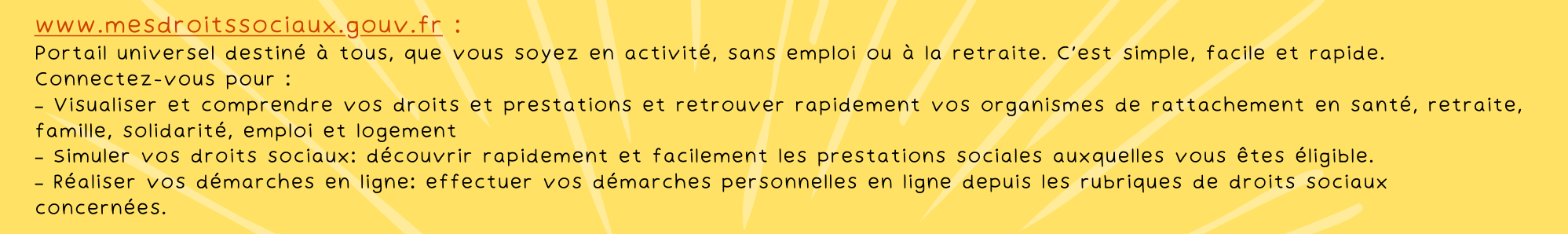 www.mesdroitssociaux.gouv.fr/ : portail universel destiné à tous, que vous soyez en activité, sans emploi ou à la retraite. C’est simple, facile et rapide.