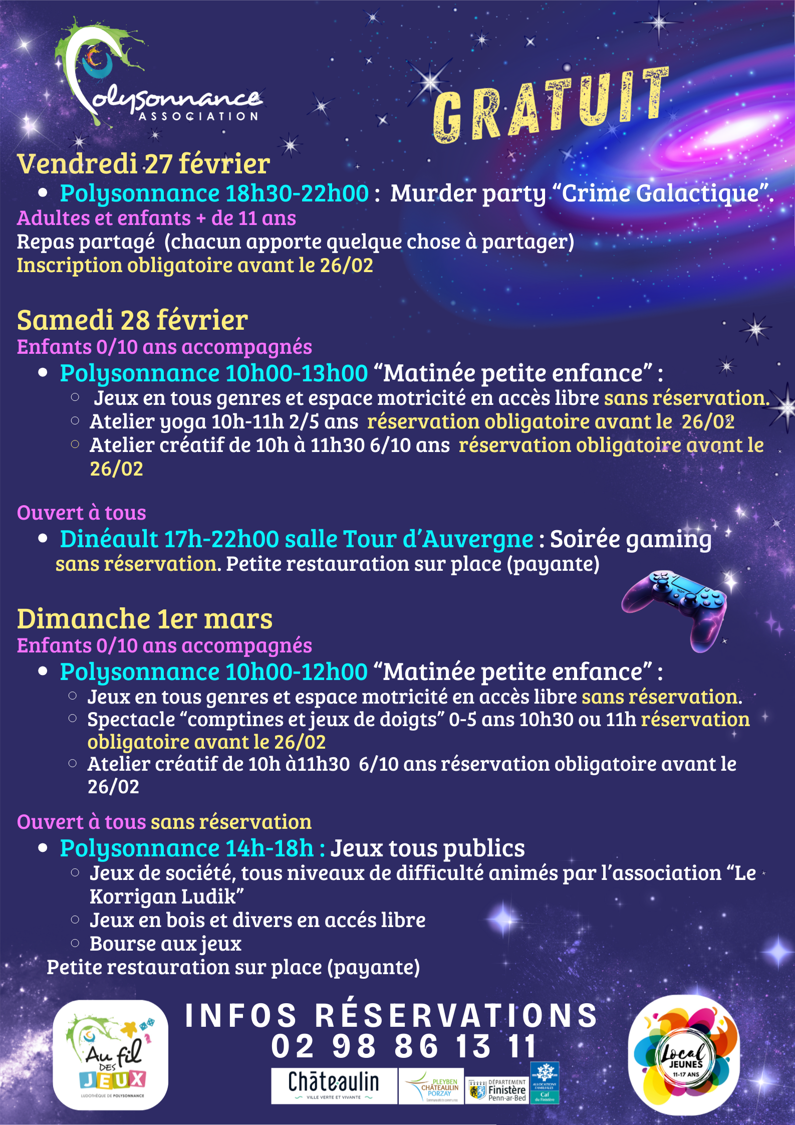 Programme intergalactique du Week-end du jeu 27-28 février et 1er mars 2026 Par polysonnance le 30 janvier 2026 dans Dernières nouvelles, Enfance, Espace jeune, Famille, Ludothèque, Non classé, Point d'info Jeunesse, Prochaines sorties 0 A decouvrirVoici le Programme des activités en famille à Polysonnance pour le mois de Février!Sur les horaires de l’accueil, venez dessiner votre robot! Une surprise vous attend!!!Venez imaginer le prochain programme des activités de Polysonnance ce samedi 7 février à partir de 10h30. Suivi d’un spécial repas crêpes sur inscription au 02 98 86 13 11 jusqu’au 5 février!!!