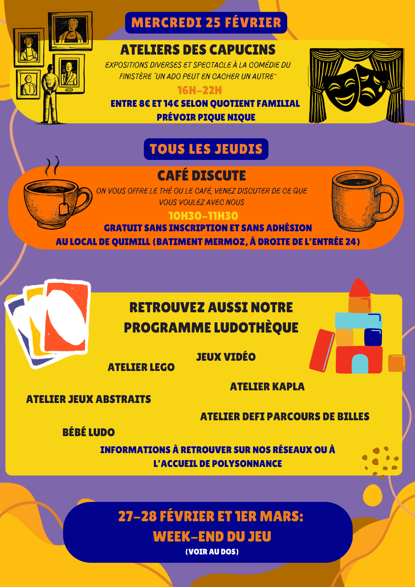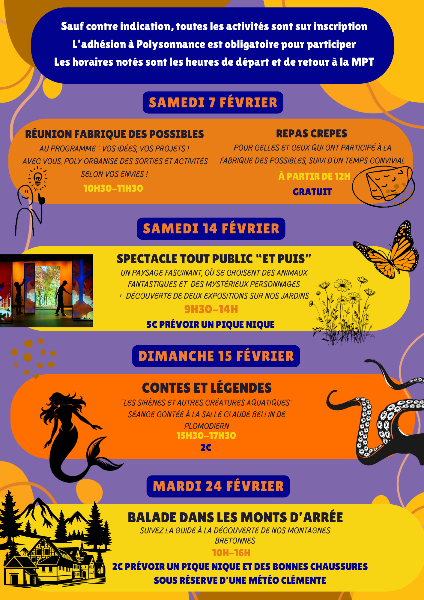 Voici le Programme des activités en famille à Polysonnance pour le mois de Février! Par polysonnance le 3 février 2026 dans Dernières nouvelles, Enfance, Espace jeune, Famille, Ludothèque, Non classé, Point d'info Jeunesse, Prochaines sorties 0 A decouvrirVoici le Programme des activités en famille à Polysonnance pour le mois de Février!Sur les horaires de l’accueil, venez dessiner votre robot! Une surprise vous attend!!!Venez imaginer le prochain programme des activités de Polysonnance ce samedi 7 février à partir de 10h30. Suivi d’un spécial repas crêpes sur inscription au 02 98 86 13 11 jusqu’au 5 février!!!